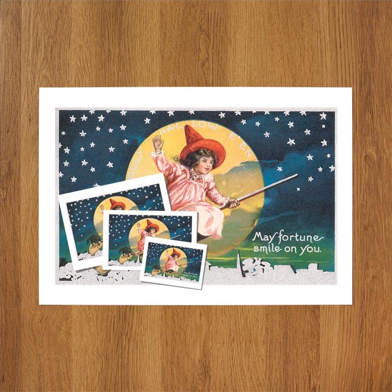 HW-10 May Fortune Smile on You, Halloween, Girl on Broomstick - Vintage Image
