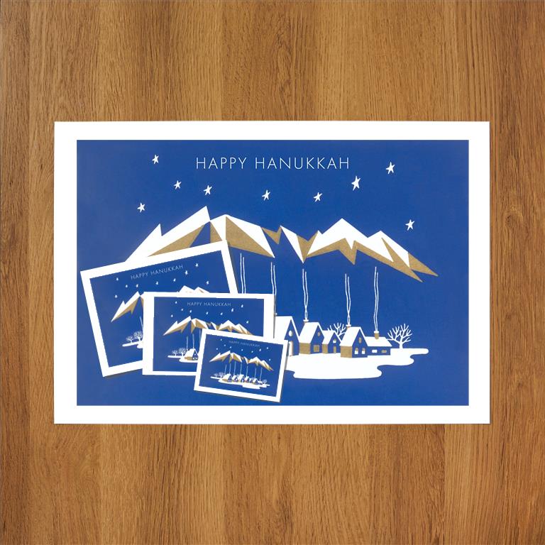 HK-06 Happy Hanukkah, Village under Geometric Clouds - Vintage Image