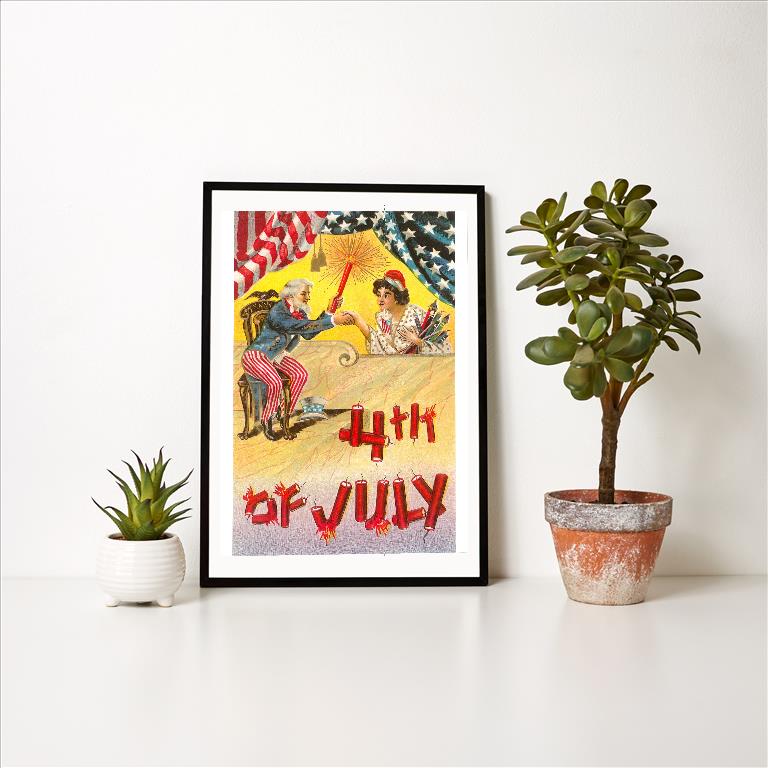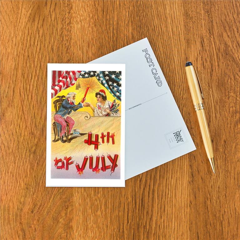 JF-12 4th of July, Uncle Sam Shaking Hands with Rocket Woman - Vintage Image