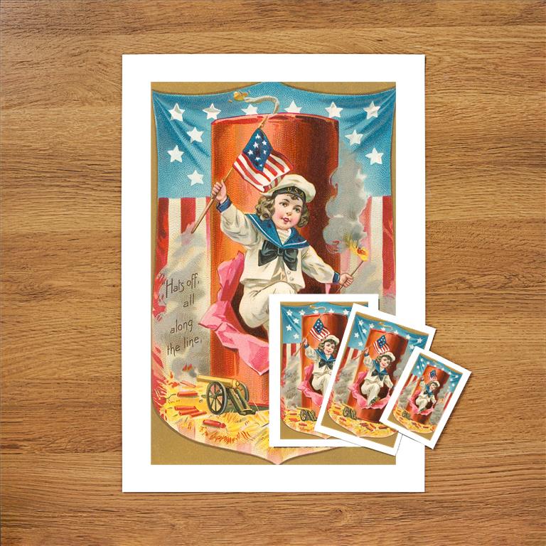JF-25 4th of July, Sailor Boy Jumping out of Rocket - Vintage Image