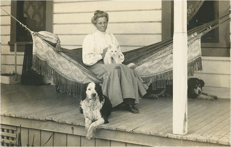 PZ-01 Woman in Hammock with Cat, Dogs - Vintage Image