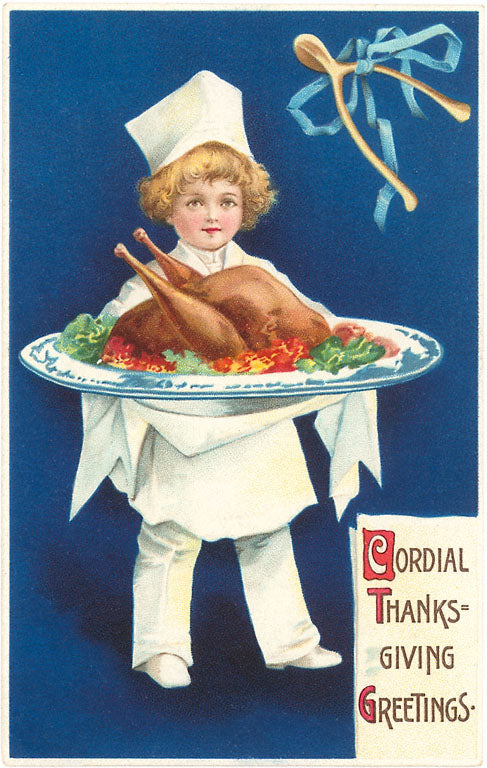 TD-11 Greetings, Boy Chef with Cooked Turkey - Vintage Image