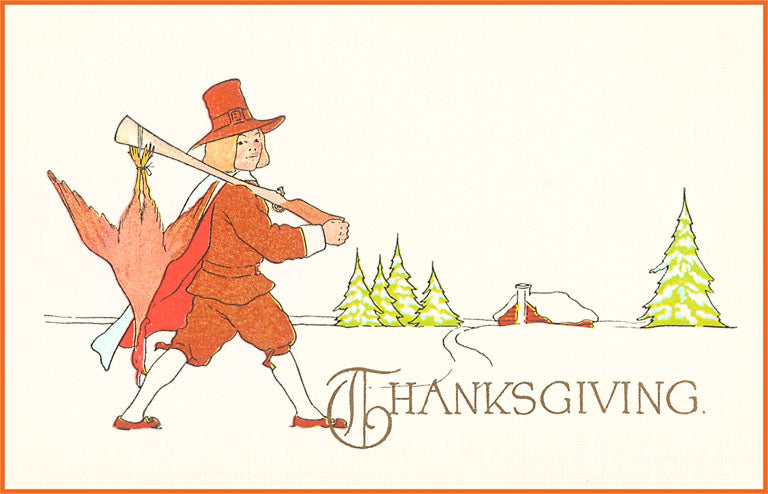 TD-108 Thanksgiving, Pilgrim with Dead Turkey on Musketq - Vintage Image