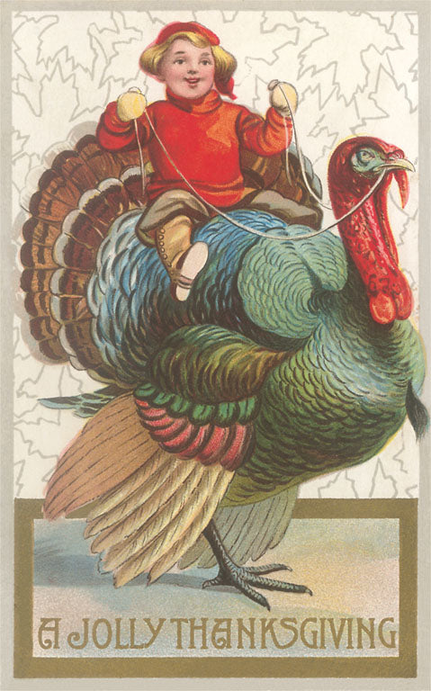TD-113 Jolly Thanksgiving, Boy Riding Turkey - Vintage Image