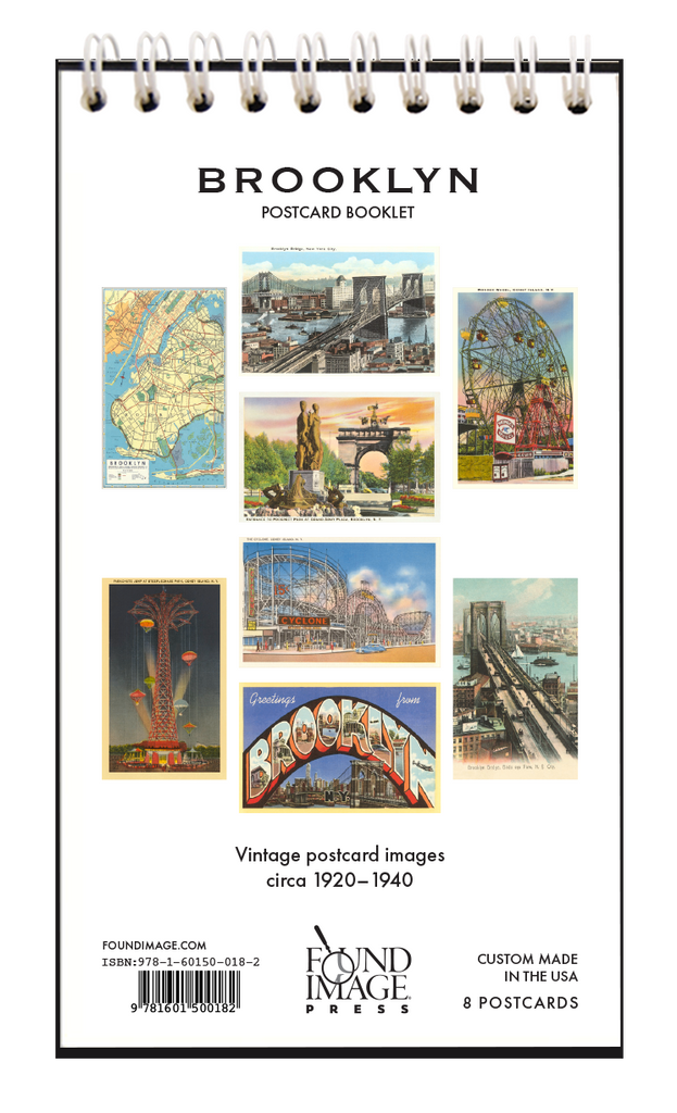 Greetings from Brooklyn! This postcard booklet features 8 beautiful vintage postcard images of Brooklyn, New York from 1920 to 1940. Coney Island, Prospect Park, and the Brooklyn Bridge grace the 8 perforated tear-out pages of this sweet little book. Spiral bound, it is printed on acid-free, natural white, heavy card stock, and measures 3.5 x 6.25. Give as a gift, enjoy as a memento, or tear out postcards to mail to your friends -- all you need is a postcard stamp! Made in the USA.