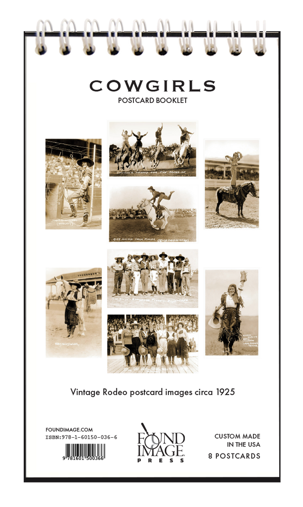This Cowgirls postcard booklet features 8 vintage sepia-toned photographs of rough-and-tumble rodeo cowgirls trick riding and performing in 1925. Spiral bound, it has 8 perforated tear-out pages, is printed on acid-free, natural white, heavy card stock, and measures 3.5x 6.25. Give as a gift, enjoy as a memento, or tear out postcards to mail to your favorite cowgirls -- all you need is a postcard stamp! Made in the USA.
