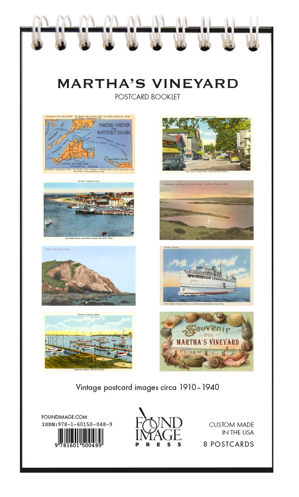 This postcard booklet features 8 vintage postcard images of Martha's Vineyard, Massachusetts from 1910 to 1940. Vintage views of a ferry steamer, Oak Bluffs Harbor, the cliffs at Gay Head, Menemsha Pond, and Edgartown Harbor grace the 8 perforated tear-out pages of this sweet little book. Spiral bound, it is printed on acid-free, natural white, heavy card stock, and measures 3.5 x 6.25. Give as a gift, enjoy as a memento, or tear out postcards to mail to your friends -- all you need is a postcard stamp! Made in the USA.