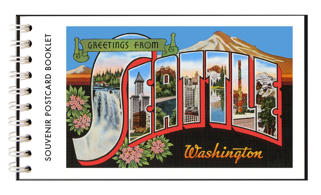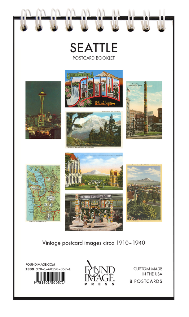 Greetings from Seattle, Washington! This postcard booklet features 8 vintage images of Seattle from 1910 to 1940. Vintage views of the Space Needle, Mt. Rainier, Pioneer Square, and Puget Sound grace the 8 perforated tear-out pages of this sweet little book. Spiral bound, it is printed on acid-free, natural white, heavy card stock, and measures 3.5 x 6.25. Give as a gift, enjoy as a memento, or tear out postcards to mail to your friends -- all you need is a postcard stamp! Made in the USA.