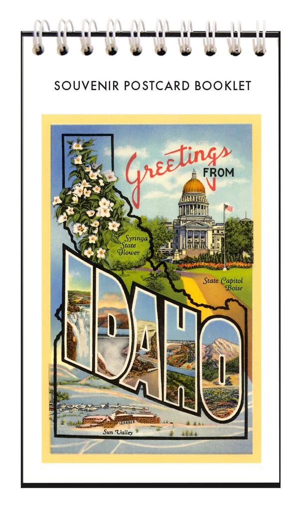 Greetings from Idaho! This postcard booklet features 8 beautiful vintage postcard images of Idaho from 1930 to 1950. Vintage views of Sun Valley, Shoshone Falls, Snake River, Lake Coeur d'Alene, and the State Capitol grace the 8 perforated tear-out pages of this sweet little book. Spiral bound, it is printed on acid-free, natural white, heavy card stock, and measures 3.5x 6.25. Give as a gift, enjoy as a memento, or tear out postcards to mail to your friends -- all you need is a postcard stamp! Made in the USA.