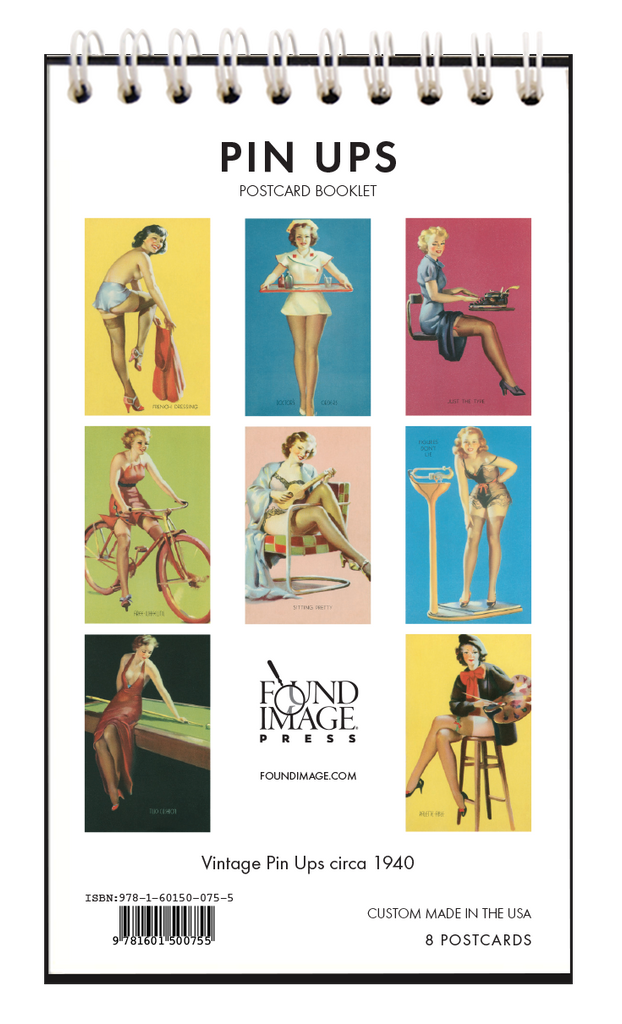 This postcard booklet features 8 vintage images of the beautiful women of Pin-Up art from the 1940s. These sexy seductive women are dressed and posed as artists, nurses, and secretaries. They ride bicycles and lounge about on chairs, scales, and pool tables. This sweet little book has 8 perforated tear-out pages, and is spiral-bound. Printed on acid-free, natural white, heavy card stock, it measures 3.5x 6.25. Give as a gift, enjoy as a memento, or tear out postcards to mail to your friends -- all you need is a postcard stamp! Made in the USA.