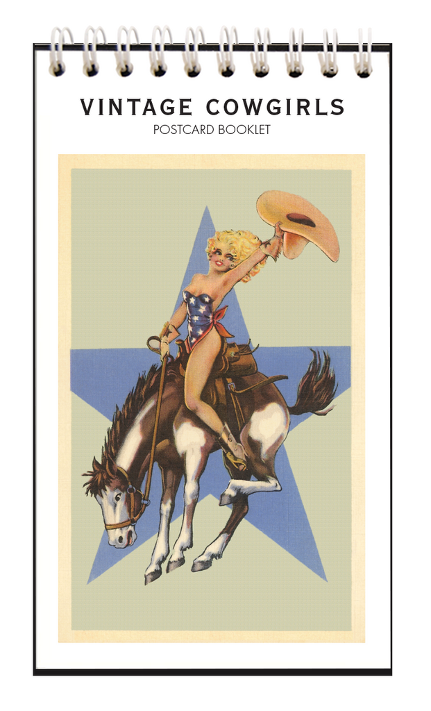 This Vintage Cowgirls postcard booklet celebrates cowgirls from 1910 to 1950. Vintage views of cowgirls riding, shooting, doing rope tricks, and posing in their finery grace the 8 perforated tear-out pages of this sweet little book. Spiral bound, it is printed on acid-free, natural white, heavy card stock, and measures 3.5x 6.25. Give as a gift, enjoy as a memento, or tear out postcards to mail to your favorite cowgirl -- all you need is a postcard stamp! Made in the USA.