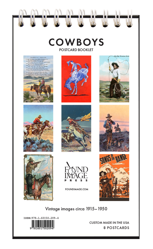 This postcard booklet features 8 vintage images of cowboys shooting, riding, lassoing, and riding the range from 1915 to 1960. Spiral bound, it has 8 perforated tear-out pages, is printed on acid-free, natural white, heavy card stock, and measures 3.5 x 6.25. Give as a gift, enjoy as a memento, or tear out postcards to mail to your favorite cowboy -- all you need is a postcard stamp! Made in the USA.