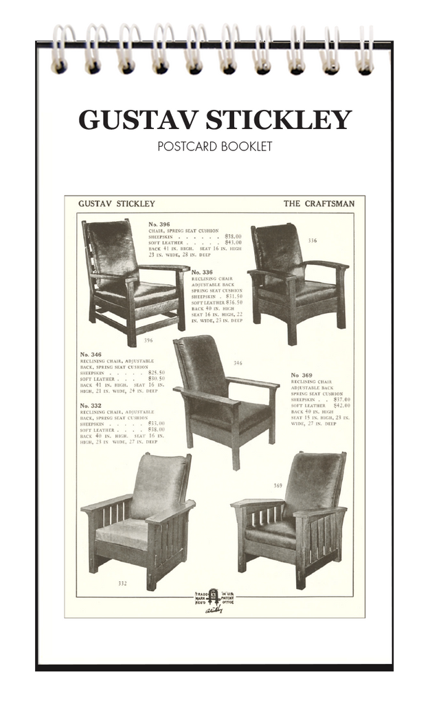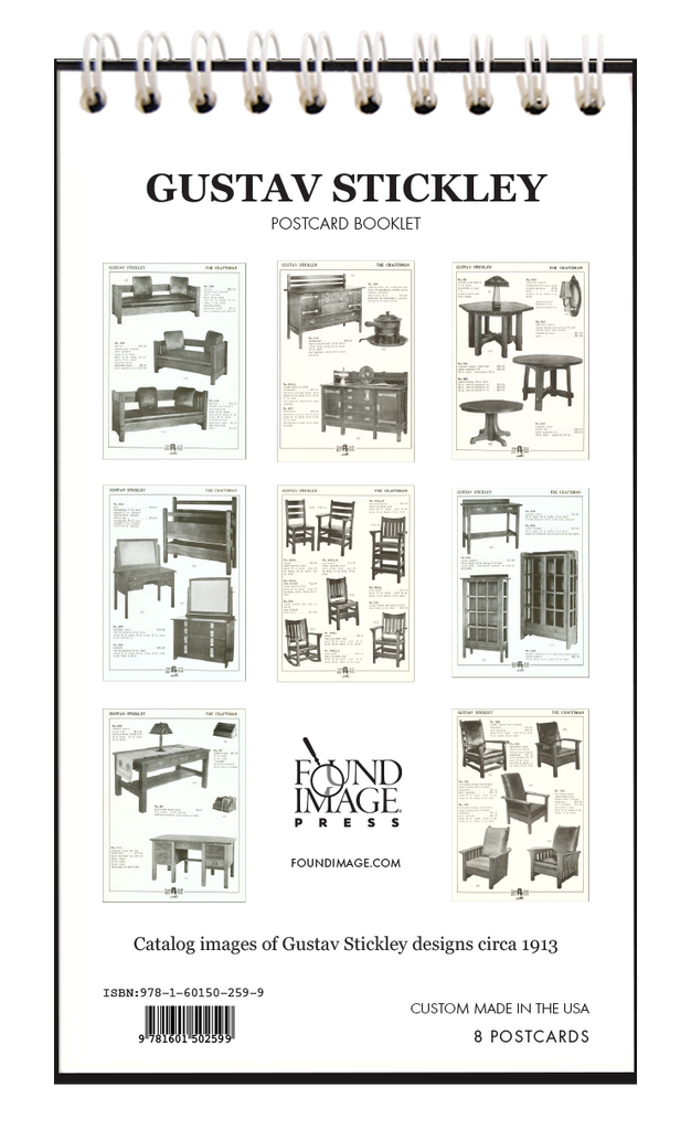 This postcard booklet features 8 vintage pages from a Gustav Stickley furniture catalog, circa 1913. Vintage images of oak chairs, tables, cabinets, and settees designed by the famous American Craftsman designer, publisher, and trend-setter, Gustav Stickley, grace the 8 perforated tear-out pages of this sweet little book. Spiral bound, it is printed on acid-free, natural white, heavy card stock, and measures 3.5 x 6.25. Give as a gift, enjoy as a memento, or tear out postcards to mail to your friends -- all you need is a postcard stamp! Made in the USA.