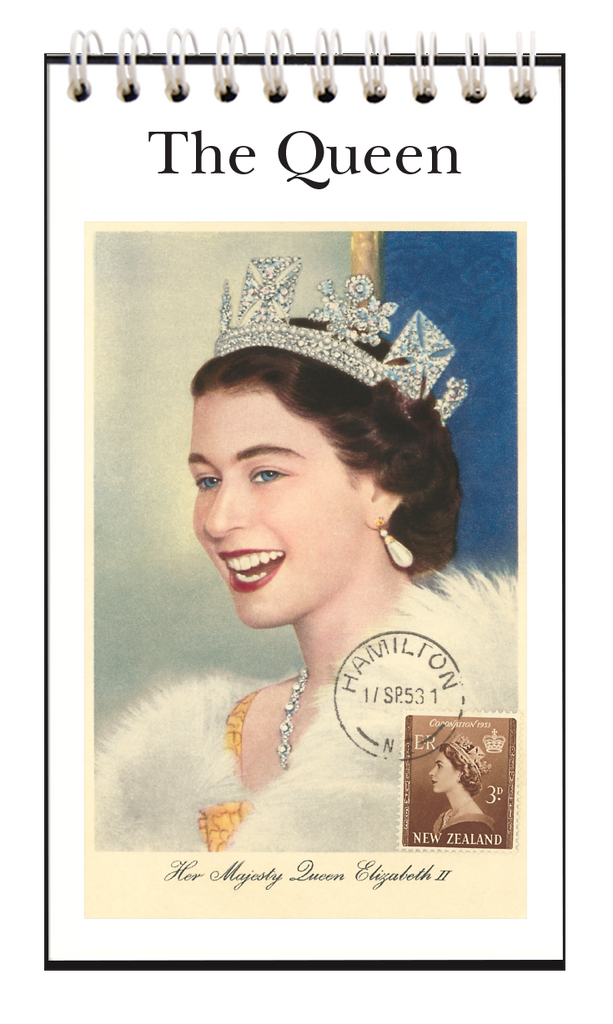 This postcard booklet features 8 beautiful vintage images of Her majesty Queen Elizabeth II from 1940 to 1960. Vintage views of the Queen in her royal attire and posed with Prince Philip grace the 8 perforated tear-out pages of this sweet little book. Spiral bound, it is printed on acid-free, natural white, heavy card stock, and measures 3.5x 6.25. Give as a gift, enjoy as a memento, or tear out postcards to mail to your favorite Anglophile -- all you need is a postcard stamp! Made in the USA.