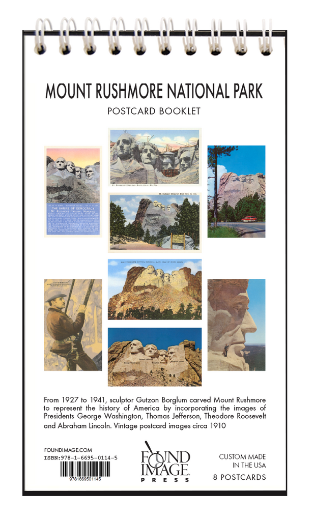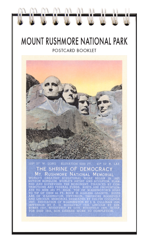 This postcard booklet features 8 vintage images of Mount Rushmore National Memorial in south Dakota circa 1910. Vintage postcard views of sculptor Gutzon Borglum’s tribute to Presidents George Washington, Thomas Jefferson, Theodore Roosevelt, and Abraham Lincoln grace the 8 perforated tear-out pages of this sweet little book. Spiral bound, it is printed on acid-free, natural white, heavy card stock, and measures 3.5” x 6.25”. Give as a gift, enjoy as a memento, or tear out postcards to mail to your friends — all you need is a postcard stamp! Like Mount Rushmore it is made in the USA.