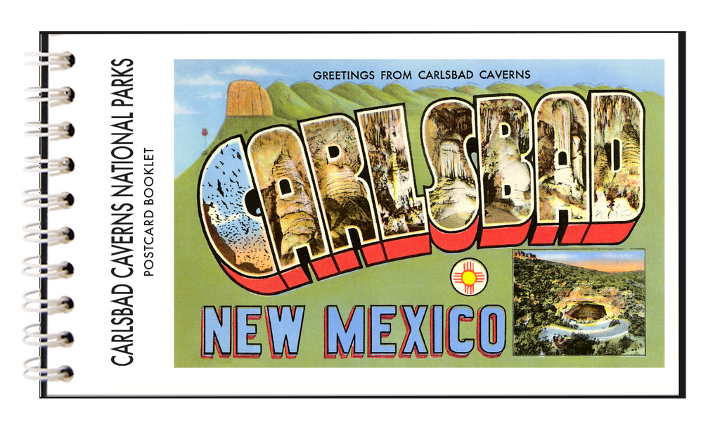 Greetings from Carlsbad Caverns National Park, New Mexico! This postcard booklet features 8 vintage images of the majestic stalactites and stalagmites of Carlsbad Caverns from 1940 to 1950. Vintage views of Giant Dome, the underground lunch room, and the serpentine entrance road grace the 8 perforated tear-out pages of this sweet little book. Spiral bound, it is printed on acid-free, natural white, heavy card stock, and measures 3.5” x 6.25”. Give as a gift, enjoy as a memento, or tear out postcards to mail to your friends — all you need is a postcard stamp! Made in the USA.