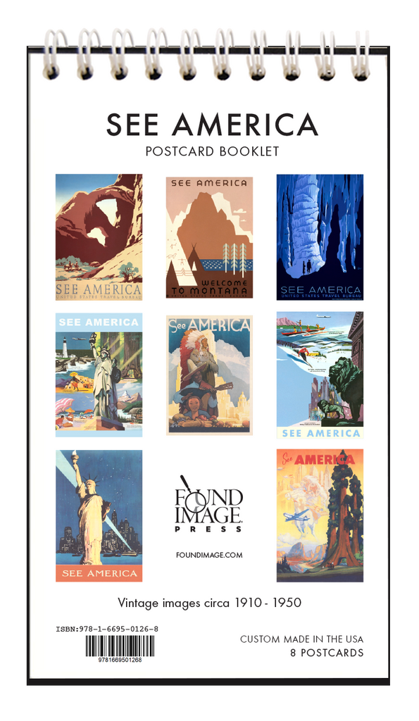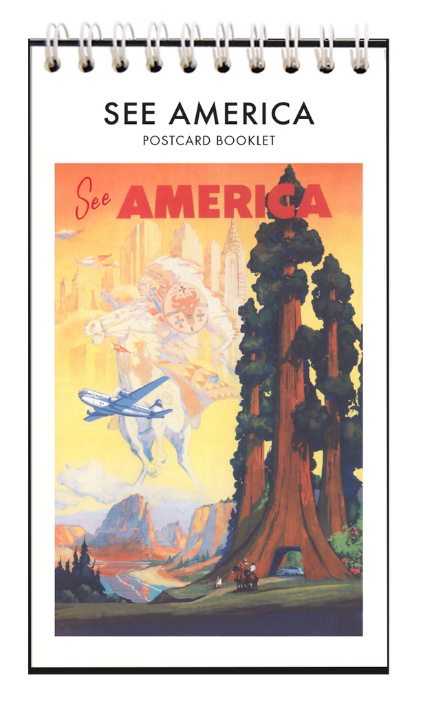 This postcard booklet features 8 vintage See America travel poster images from 1910 to 1950. Vintage views of the great deserts, mountains, caves, giant trees, ski slopes, and monuments of America grace the 8 perforated tear-out pages of this sweet little book. Spiral bound, it is printed on acid-free, natural white, heavy card stock, and measures 3.5” x 6.25”. Give as a gift, enjoy as a memento, or tear out postcards to mail to your friends — all you need is a postcard stamp! It’s about the USA and it’s made in the USA!