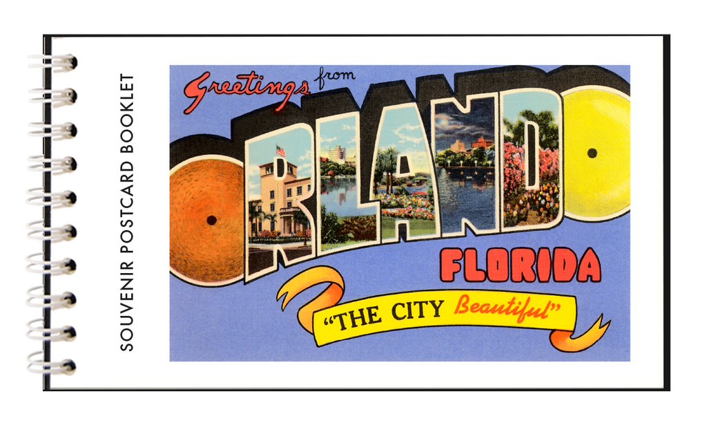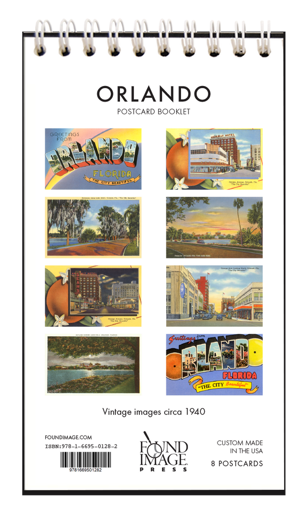Greetings from Orlando, Florida, the City Beautiful! This postcard booklet features 8 vintage images of Orlando from the 1940s. Vintage views of downtown, Orange Ave., Lake Eola, and Lake Adair grace the 8 perforated tear-out pages of this sweet little book. Spiral bound, it is printed on acid-free, natural white, heavy card stock, and measures 3.5” x 6.25”. Give as a gift, enjoy as a memento, or tear out postcards to mail to your favorite Floridians — all you need is a postcard stamp! Made in the USA.