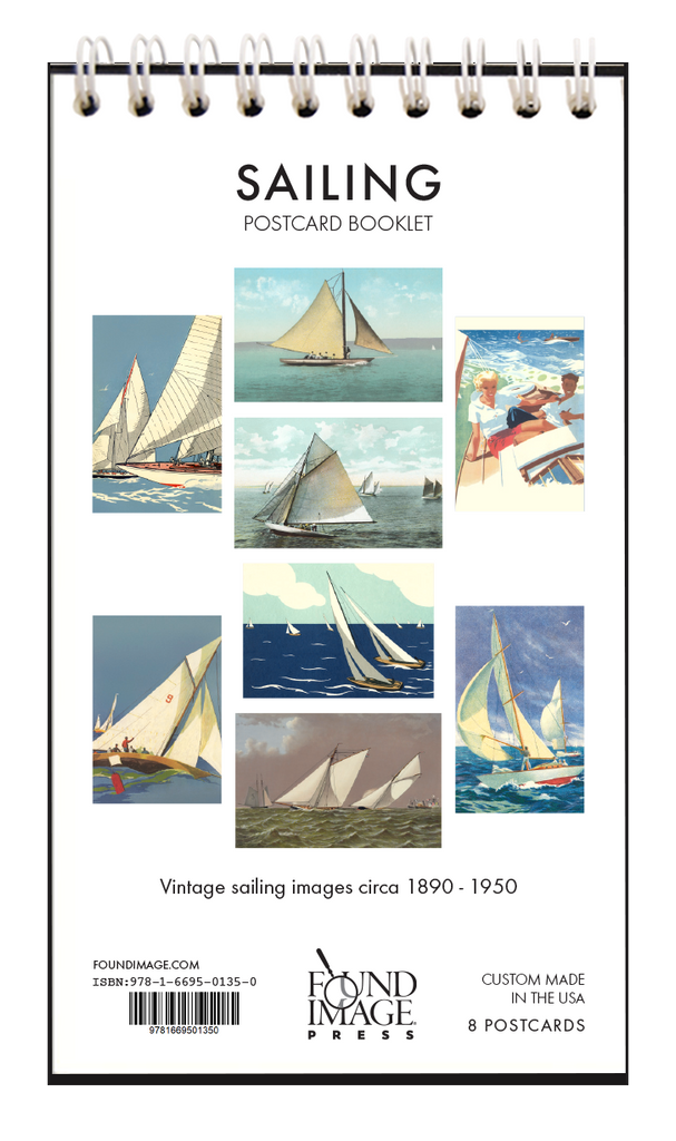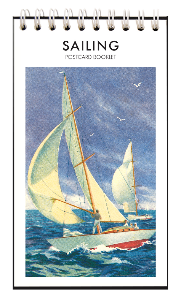This postcard booklet features 8 vintage images of sailboats and sailors from 1890 to 1950. Vintage views of sailboats and sailors sailing the open seas grace the 8 perforated tear-out pages of this sweet little book. Spiral bound, it is printed on acid-free, natural white, heavy card stock, and measures 3.5” x 6.25”. Give as a gift, enjoy as a memento, or tear out postcards to mail to your friends — all you need is a postcard stamp! Made in the USA.