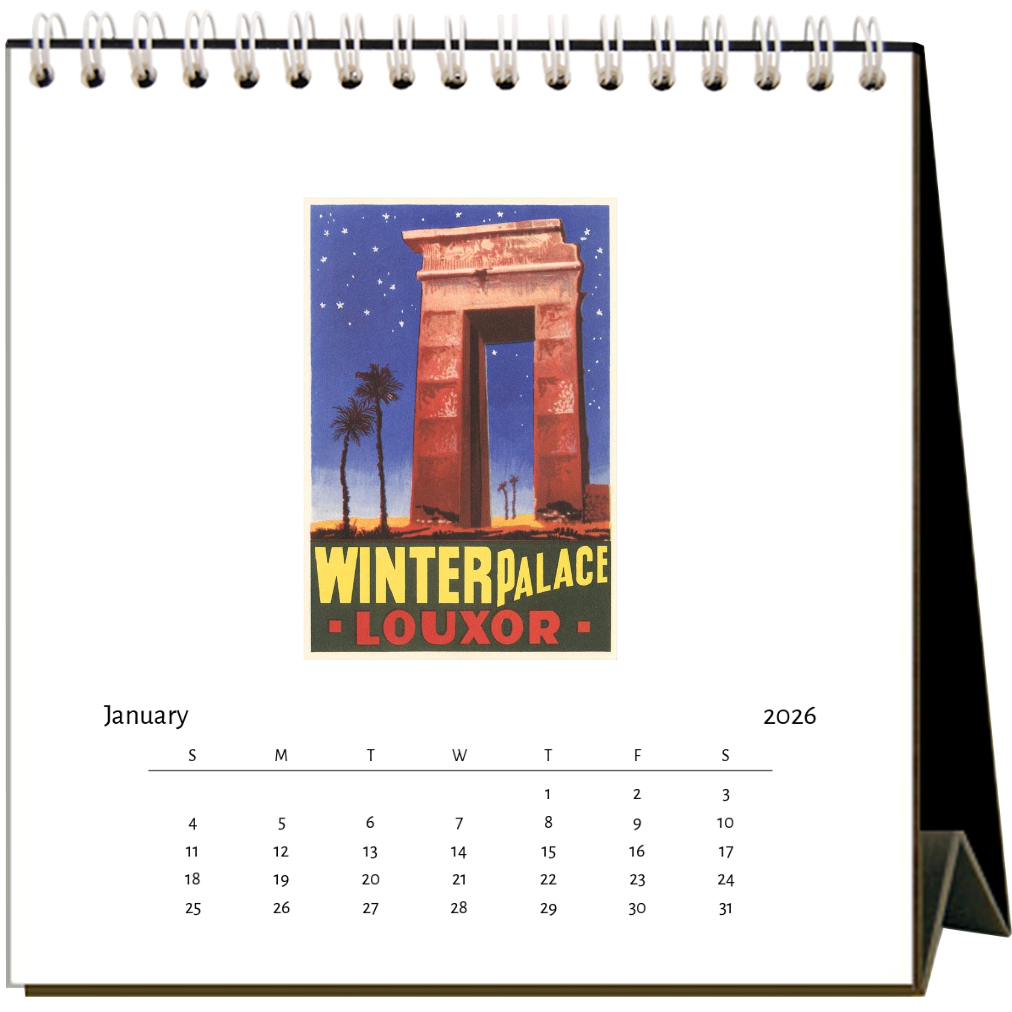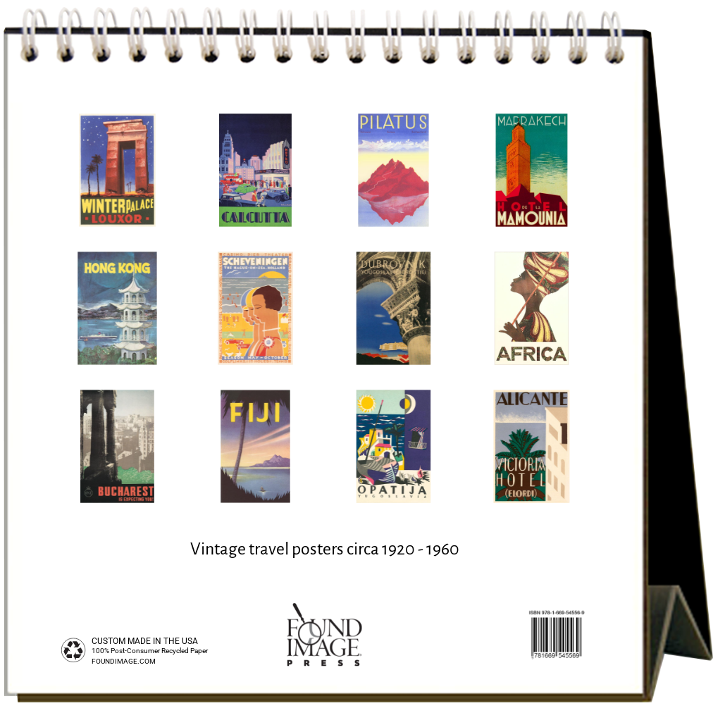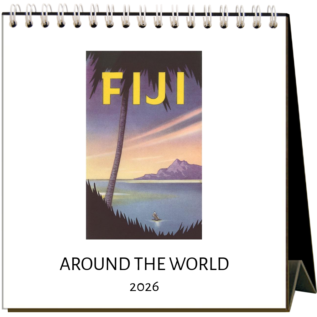 The world is at your fingertips with this beautiful Around the World easel desk calendar perched on your desk. Take a trip from Egypt, to Fiji, to Hong Kong, Africa, Spain, and beyond. The calendar features 12 full-color vintage images (1920 â 1960) of travel posters from all over the world and measures 6â" x 7â" x 3â" when expanded. It's printed on 100% post-consumer recycled, acid-free, natural white, heavy cardstock and is made in the USA. Bon voyage!