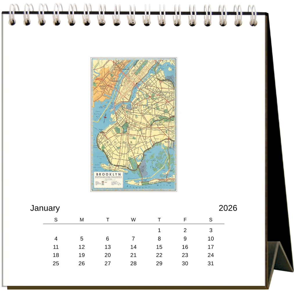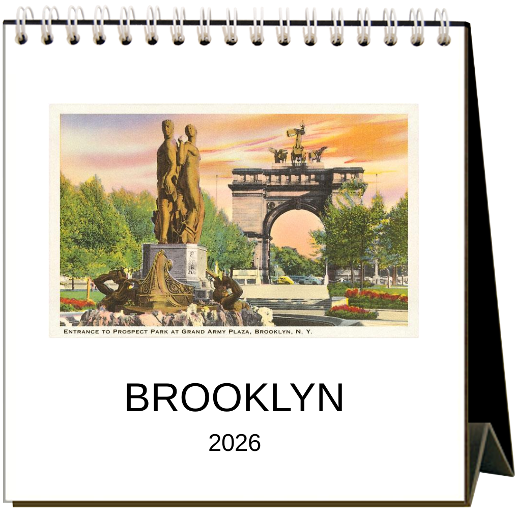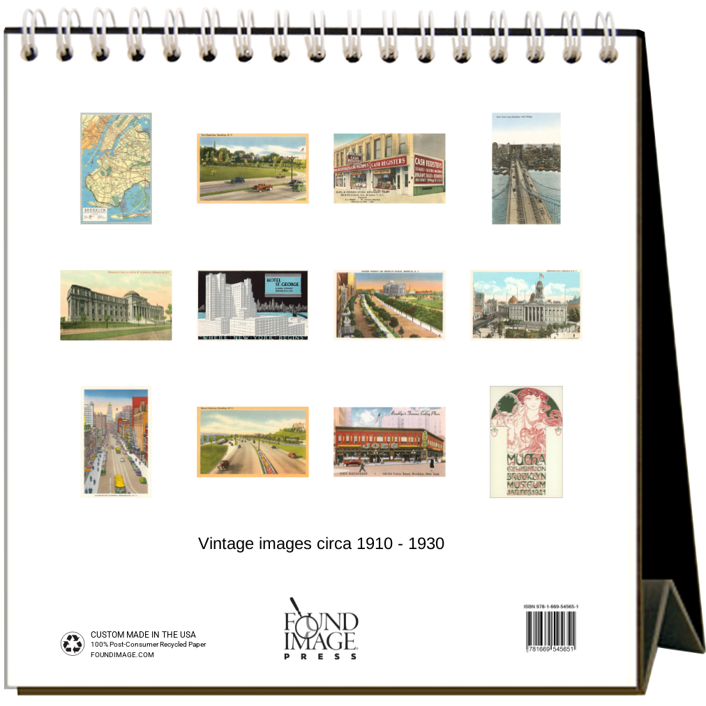 Twelve vintage postcard images (1910 - 1930) of Brooklyn, New York grace the pages of this easel desk calendar. Stroll across the Brooklyn Bridge, visit Prospect Park, the Institute of Arts and Science, Borough Hall, and Livingston Street with this calendar perched on your desk. Printed on 100% post-consumer recycled, acid-free, natural white, heavy cardstock, the calendar measures 6â" x 7â" x 3â" when expanded and is made in the USA!