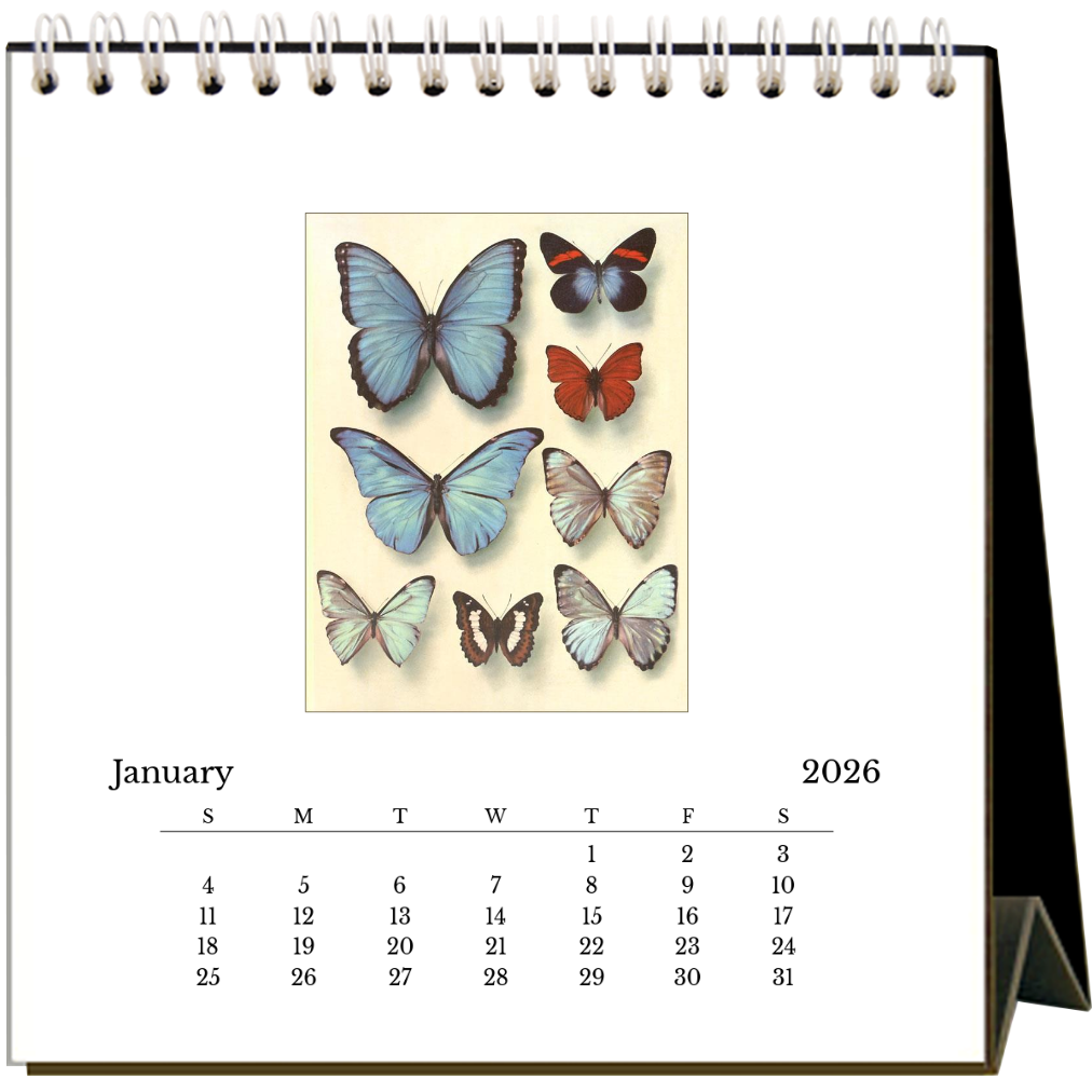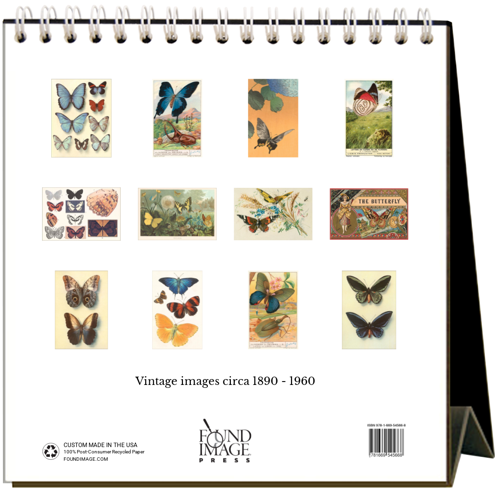 What a nice surprise to suddenly find a variety of colorful Butterflies flitting from one blossom to the next! Lovely, enchanting, vibrant butterflies float across each page of this easel desk calendar that features 12 vintage images from 1890 to 1960. The calendar is printed on 100% post-consumer recycled, acid-free, natural white, heavy cardstock, and measures 6â" x 7â" x 3â" when expanded. Made in the USA.