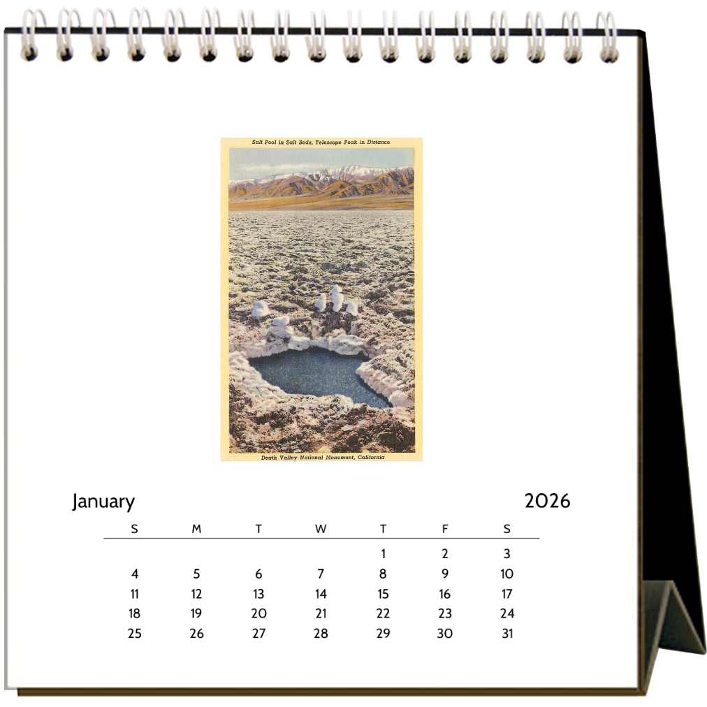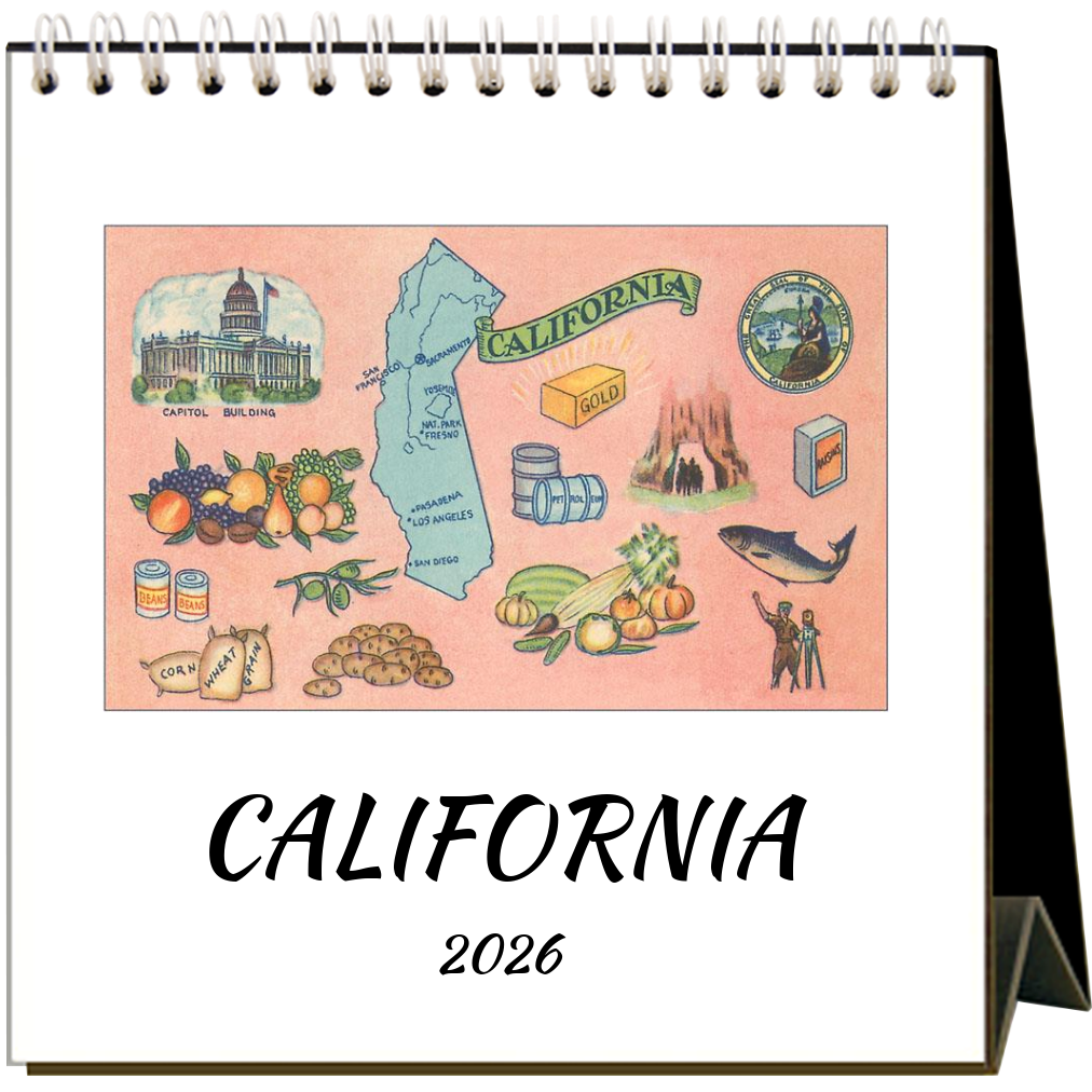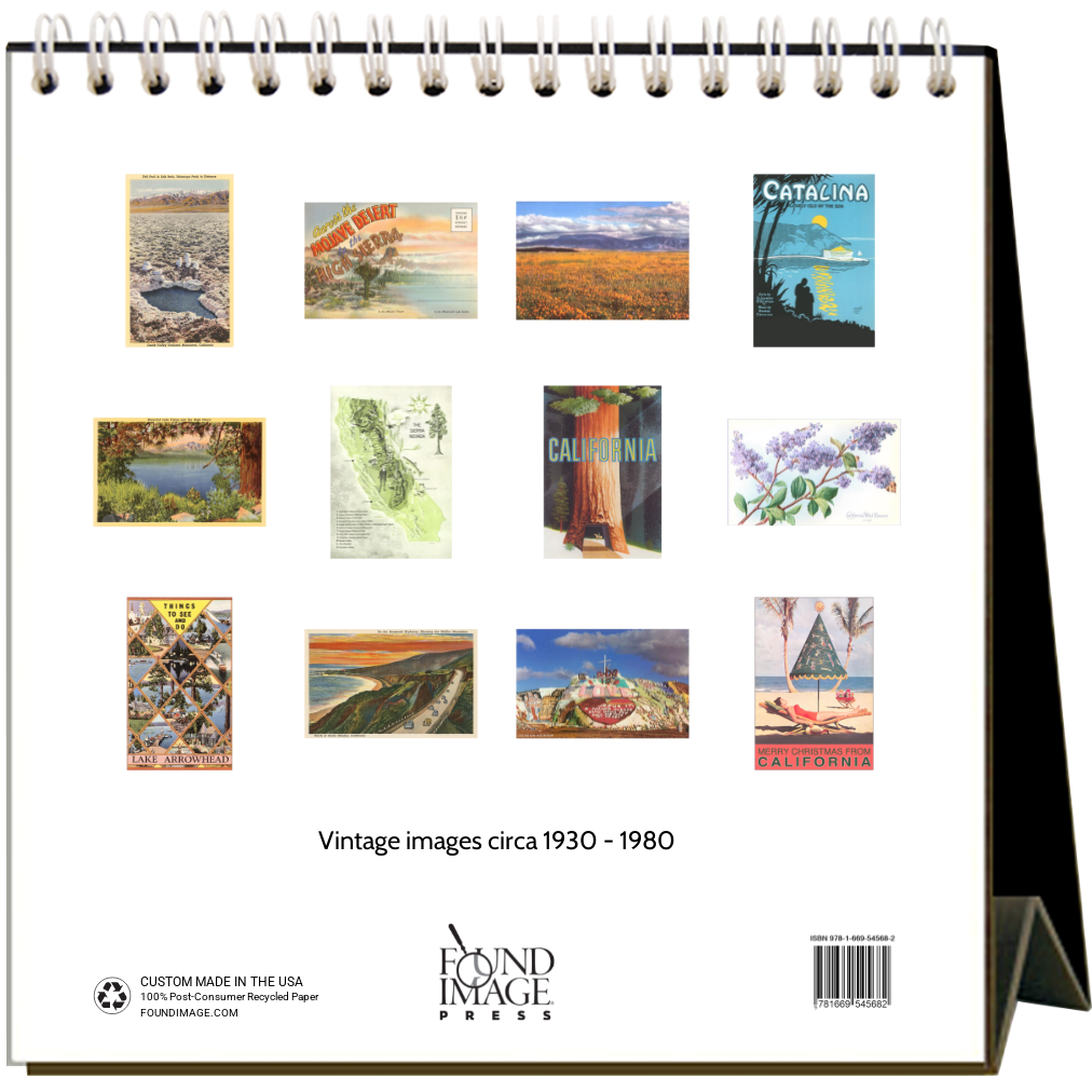 Welcome to California, land of surf, sunshine, mountains, deserts, lakes, and breathtaking sunsets. This easel desk calendar features 12 vintage images (1930 to 1980) of Lake Tahoe, Death Valley, Malibu, Catalina Island, Salvation Mountain, the Mojave Desert, and fields of California poppies.Measuring 6â" x 7â" x 3â" when expanded, it's printed on 100% post-consumer recycled, acid-free, natural white, heavy cardstock, and is made in the USA!