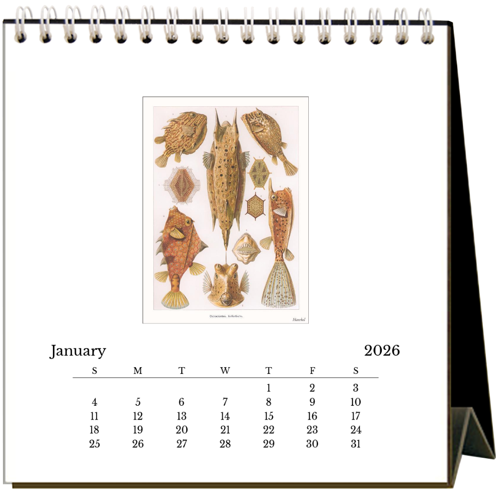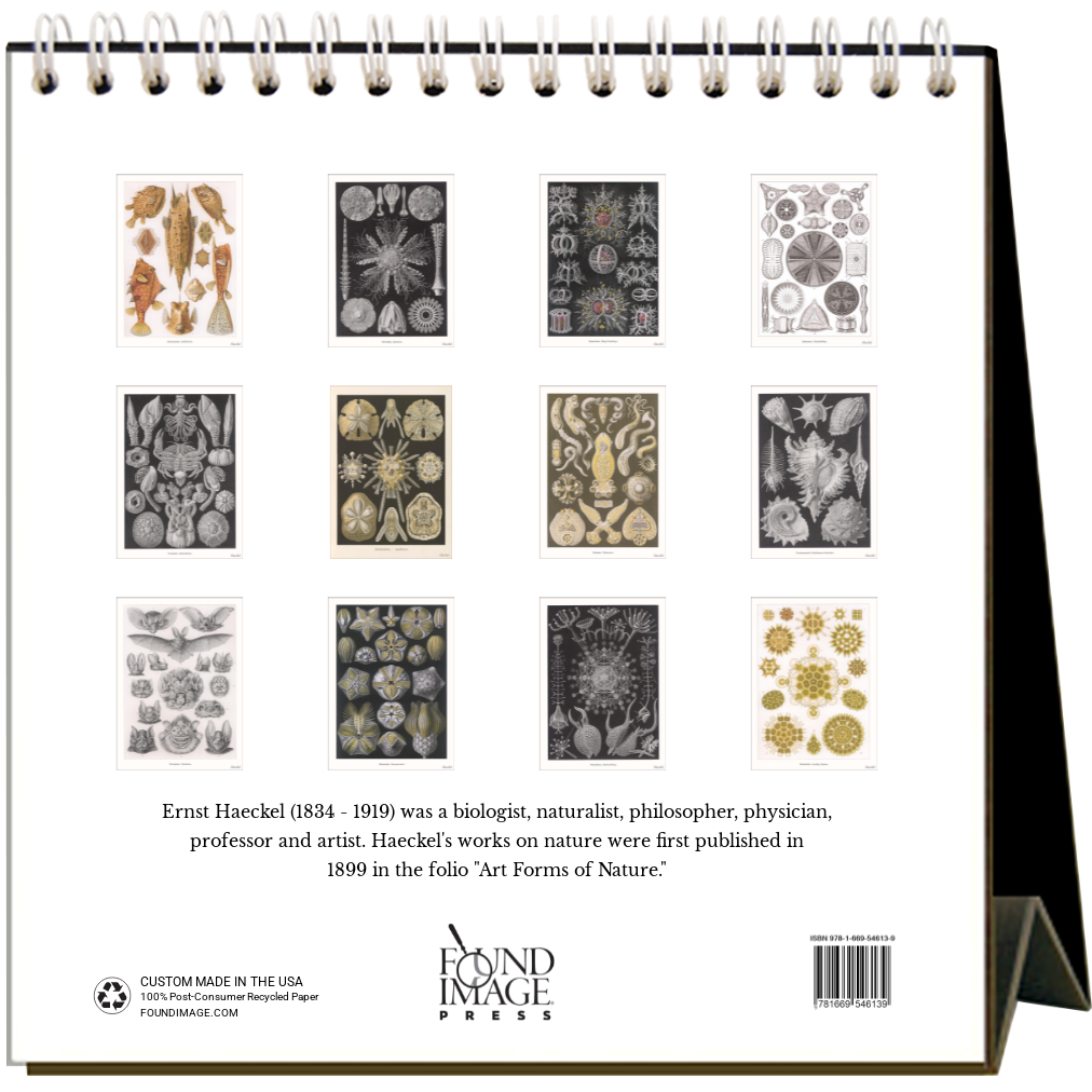 This Art Forms of Nature easel desk calendar features the stunning art of biologist, naturalist, philosopher, physician, and professor, Ernst Haeckel (1834 - 1919). The calendar is printed on 100% post-consumer recycled, acid-free, natural white, heavy cardstock and measures 6â" x 7â" x 3â" when expanded. Made in the USA!