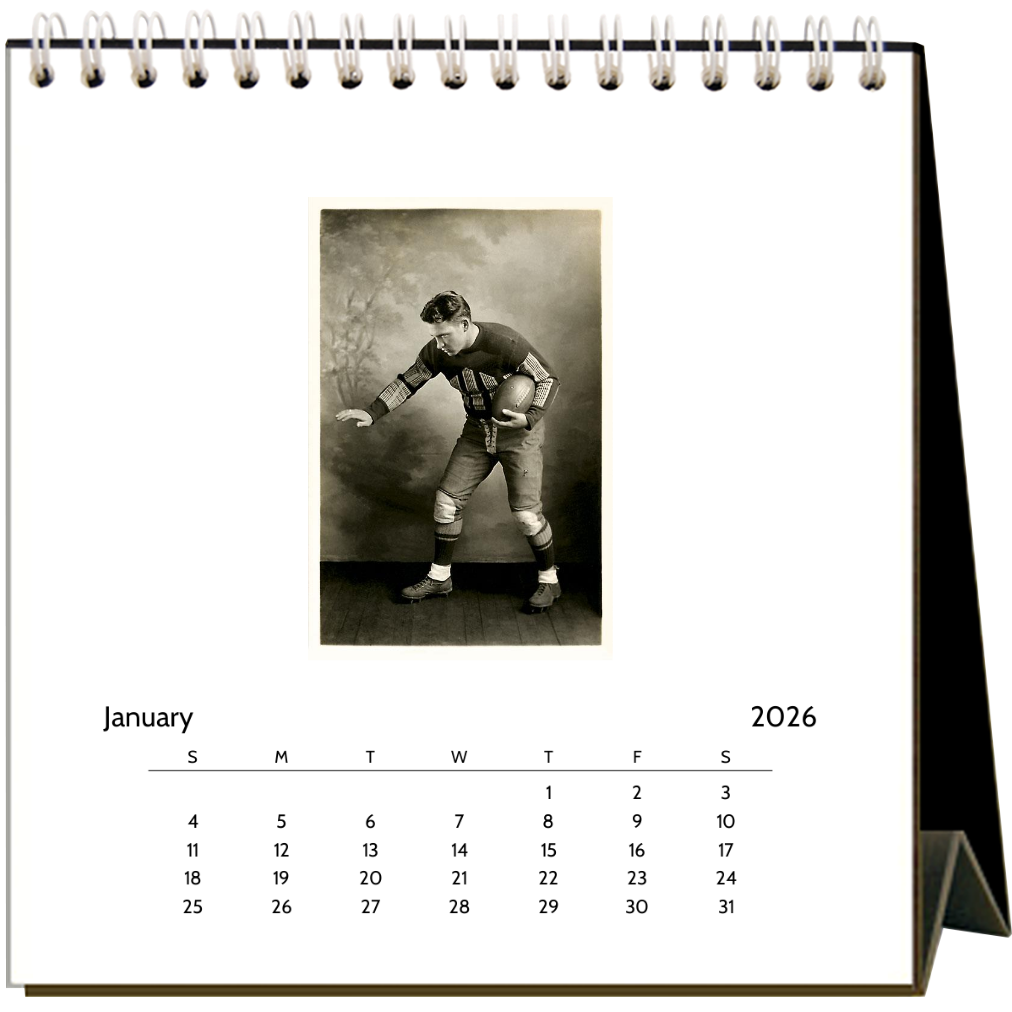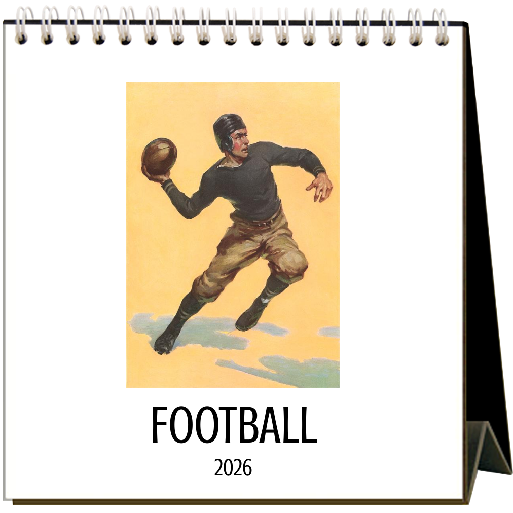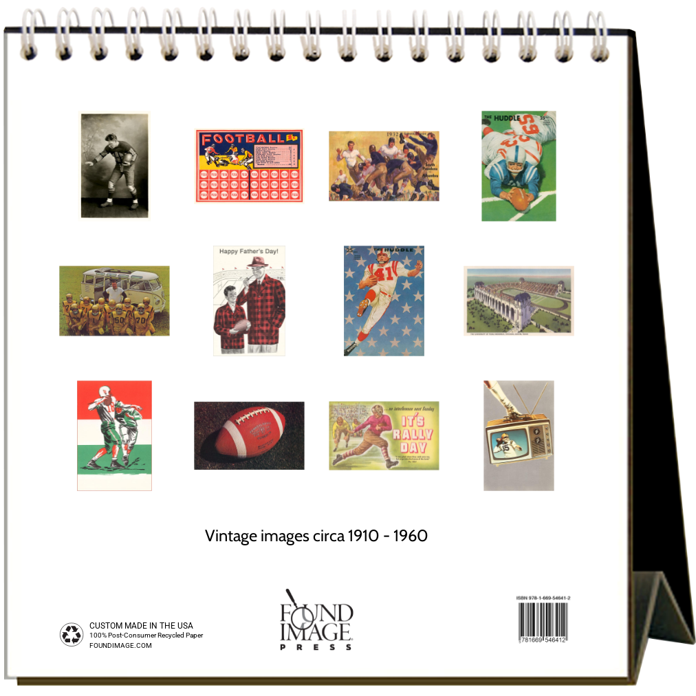 What do you get when you meld soccer and rugby? America's favorite sport -- Football! This easel desk calendar celebrates this uniquely American sport with 12 vintage images (1910 - 1960) of men passing, kicking, catching, and running the ball. Printed on 100% post-consumer recycled, acid-free, natural white, heavy cardstock, the calendar is 6" x 7" x 3" when expanded. Just like football, it's made in the USA. Touchdown!