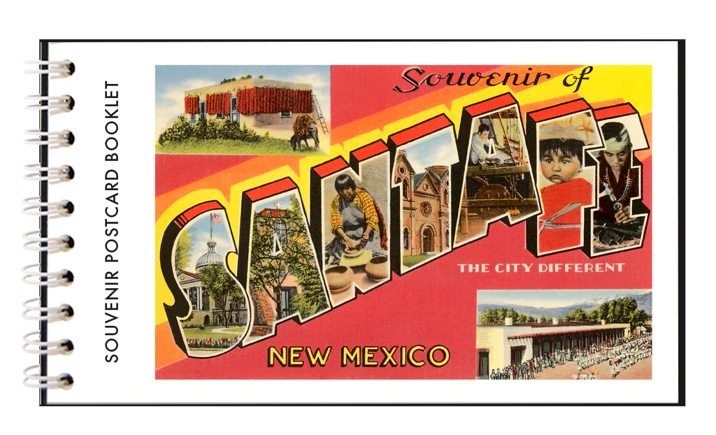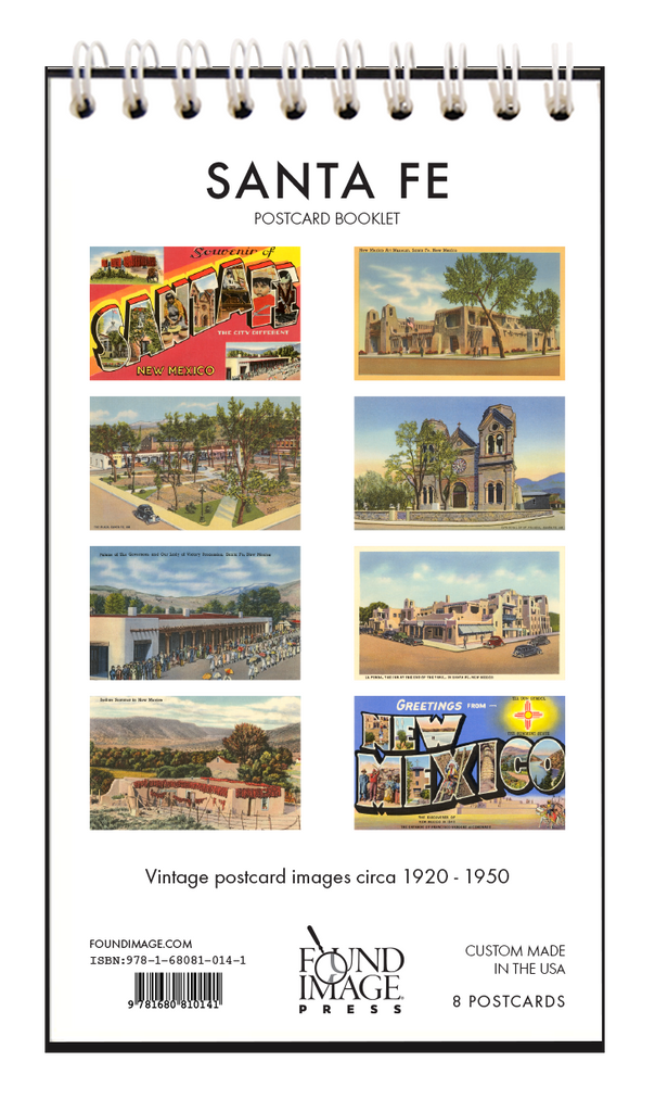 This postcard booklet features 8 vintage images of Santa Fe, New Mexico from 1920 to 1950. Vintage views of St. Francis Cathedral, La Fonda Hotel, the Fine Arts Museum, the Plaza, and the Palace of the Governors grace the 8 perforated tear-out pages of this sweet little book. Spiral bound, it is printed on acid-free, natural white, heavy card stock, and measures 3.5x 6.25. Give as a gift, enjoy as a memento, or tear out postcards to mail to your friends -- all you need is a postcard stamp! Made in the USA.
