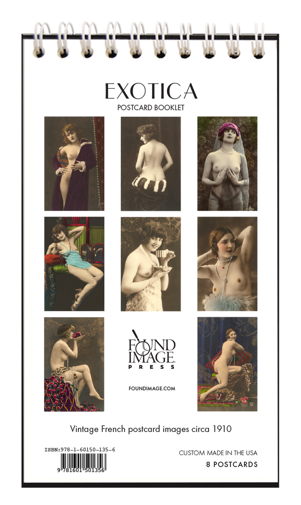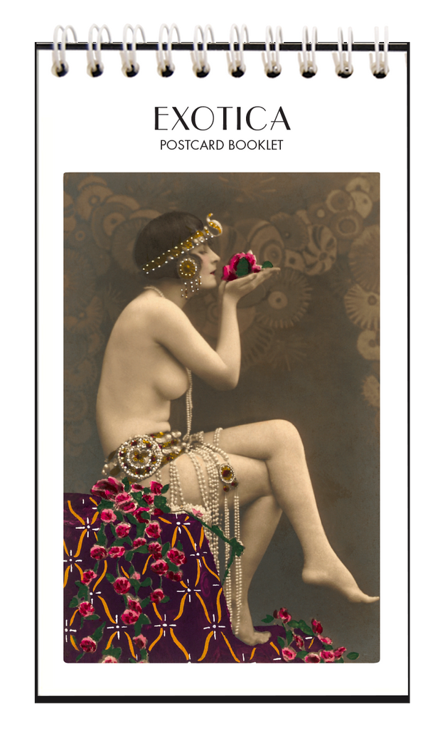This Exotica postcard booklet features 8 vintage hand-tinted French postcard images from 1910 of luscious and seductive semi-nude women in exotic poses. Spiral bound, it has 8 perforated tear-out pages, is printed on acid-free, natural white, heavy card stock, and measures 3.5 x 6.25. Give as a gift, enjoy as a memento, or tear out postcards to mail to your friends -- all you need is a postcard stamp! Made in the USA.
