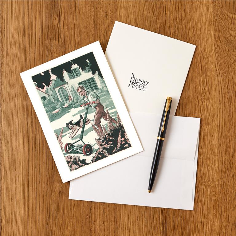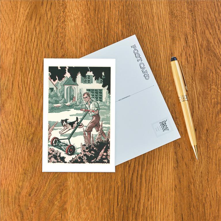AM-121 Industrious Boy Mowing Lawn - Vintage Image