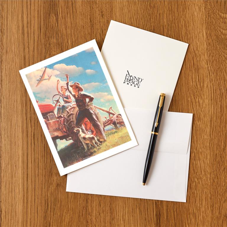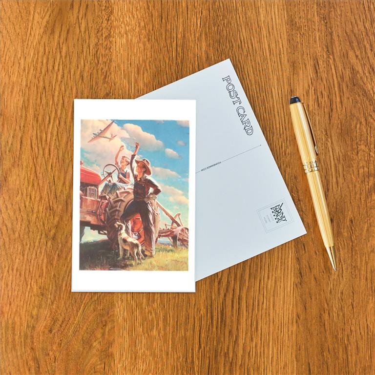 AM-165 Farmer and Son Waving to Airplane - Vintage Image