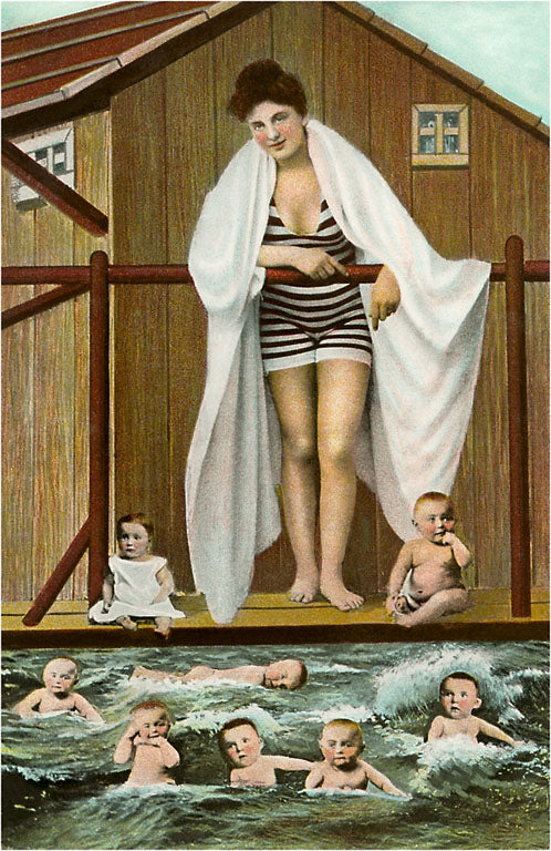 BY-06 Woman in Striped Bathing Costume with Babies in Water - Vintage Image